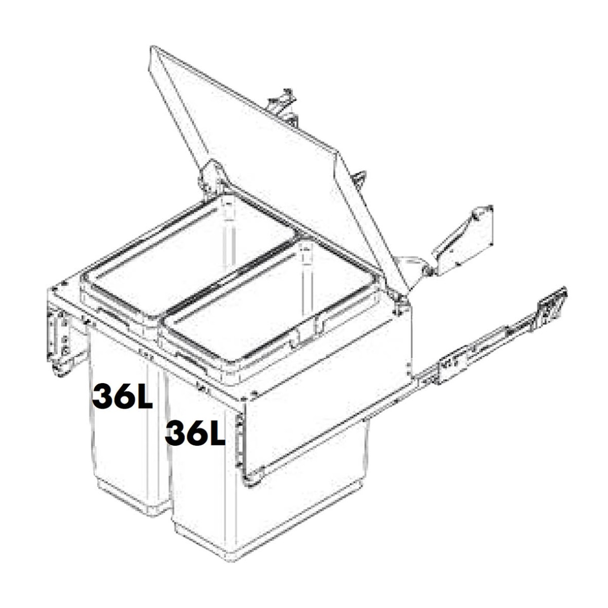 Merk: Vibo Kleur: Grijs Montage: Aan de zijwanden en aan het front, volledig uittrekbaar. Voor kastbreedte: 600 mm. Inhoud: 72 liter ( 2 x 36). Kastdeurlogo: Frontdeurkast Afvalscheiding: Ja portokostentarief: Pakketpost Inbouwmaten (bxdxh): 564 x 485 x 596 mm