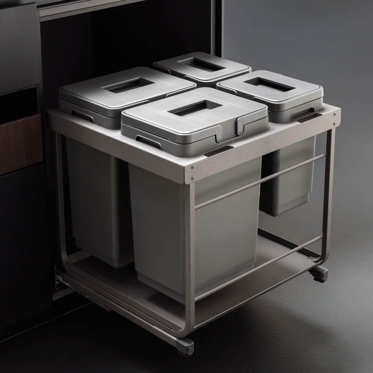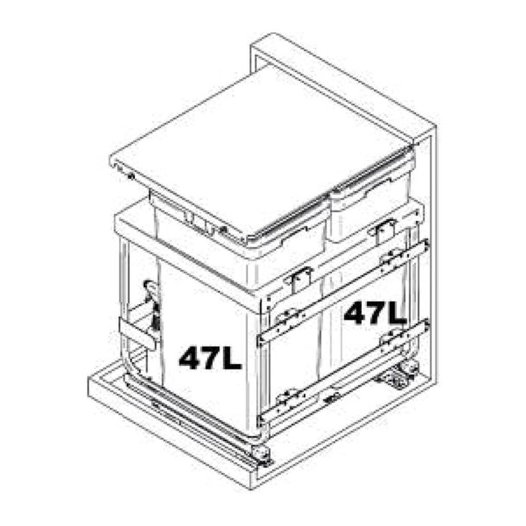 Merk: Vibo Kleur: Grijs Montage: Op de kastbodem en aan het front. Voor kastbreedte: 600 mm. Inhoud: 94 liter ( 2 x 47). Kastdeurlogo: Frontdeurkast Afvalscheiding: Ja portokostentarief: Pakketpost Inbouwmaten (bxdxh): 550 x 481 x 645 mm