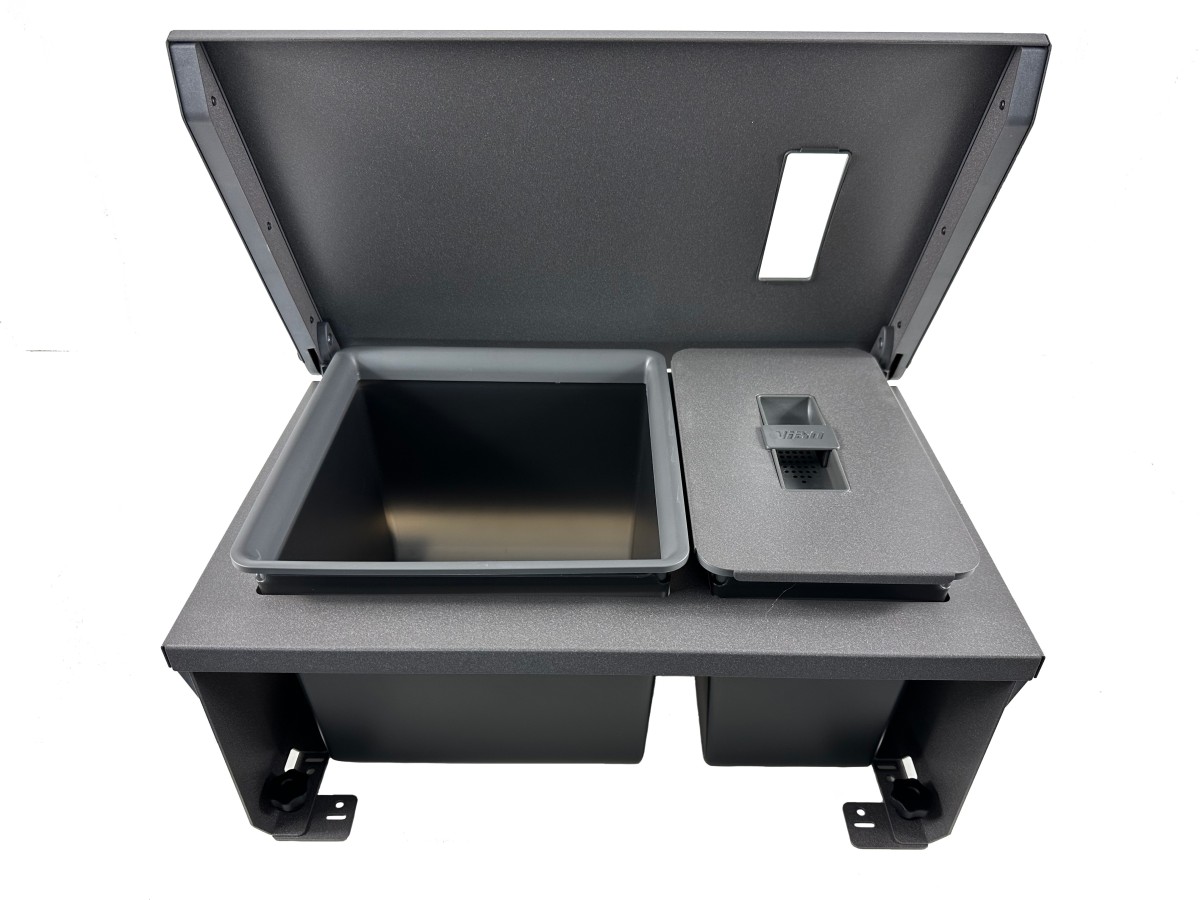 Merk: Vibo Kleur: Grijs Montage: Op de ladebodem en aan het ladefront. Voor kastbreedte: 600 mm. Inhoud: 19,4 liter ( 12,6+6,8). Afvalscheiding: Ja portokostentarief: Pakketpost Inbouwmaten (bxdxh): 564 x 359 x 277 mm