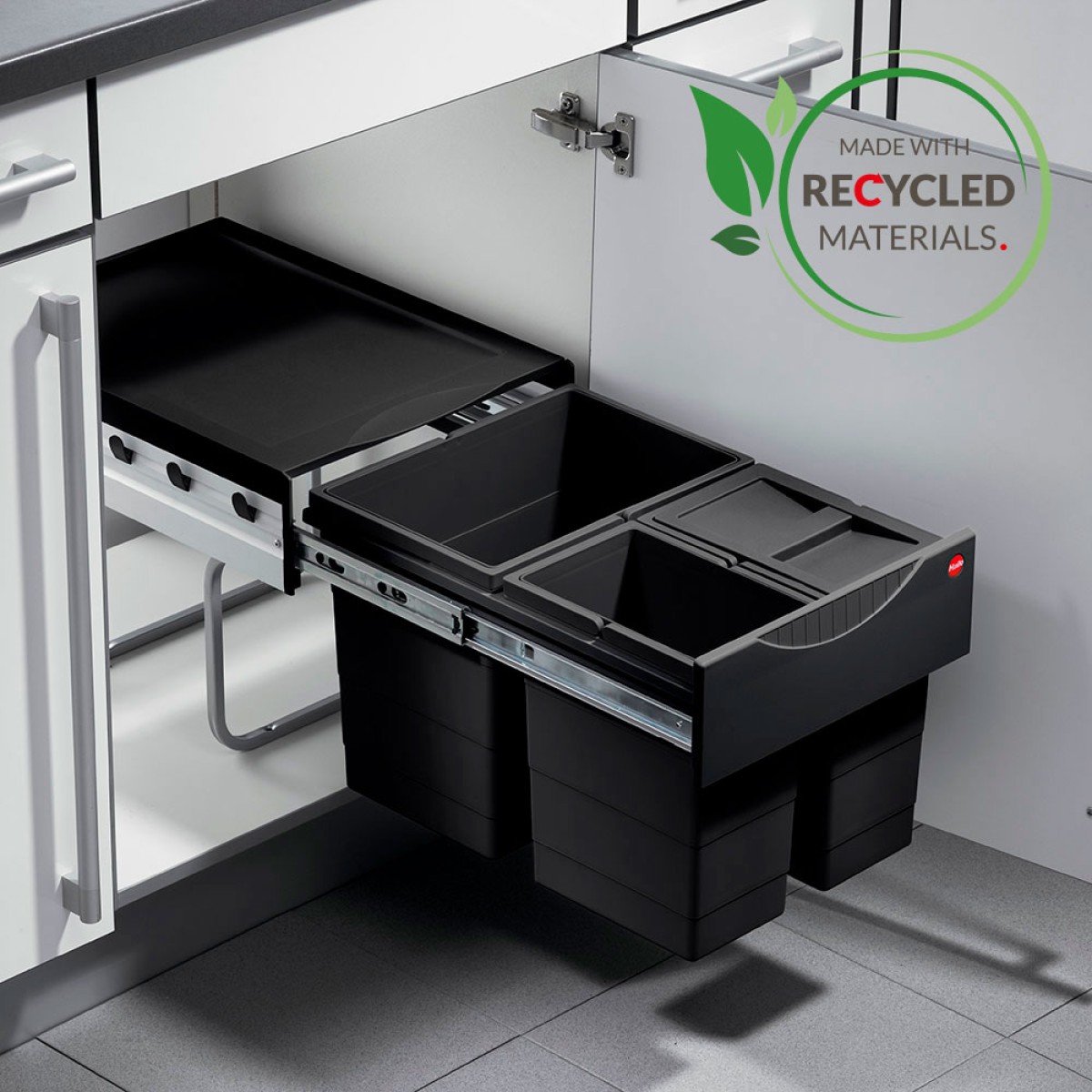 Merk: Hailo Kleur: Zwart Montage: Op de kastbodem, volledig uittrekbaar. Voor kastbreedte: 400 mm. Inhoud: 35 liter ( 18 + 2x 8.5 ) Kastdeurlogo: Draaideurkast Afvalscheiding: Ja portokostentarief: Pakketpost