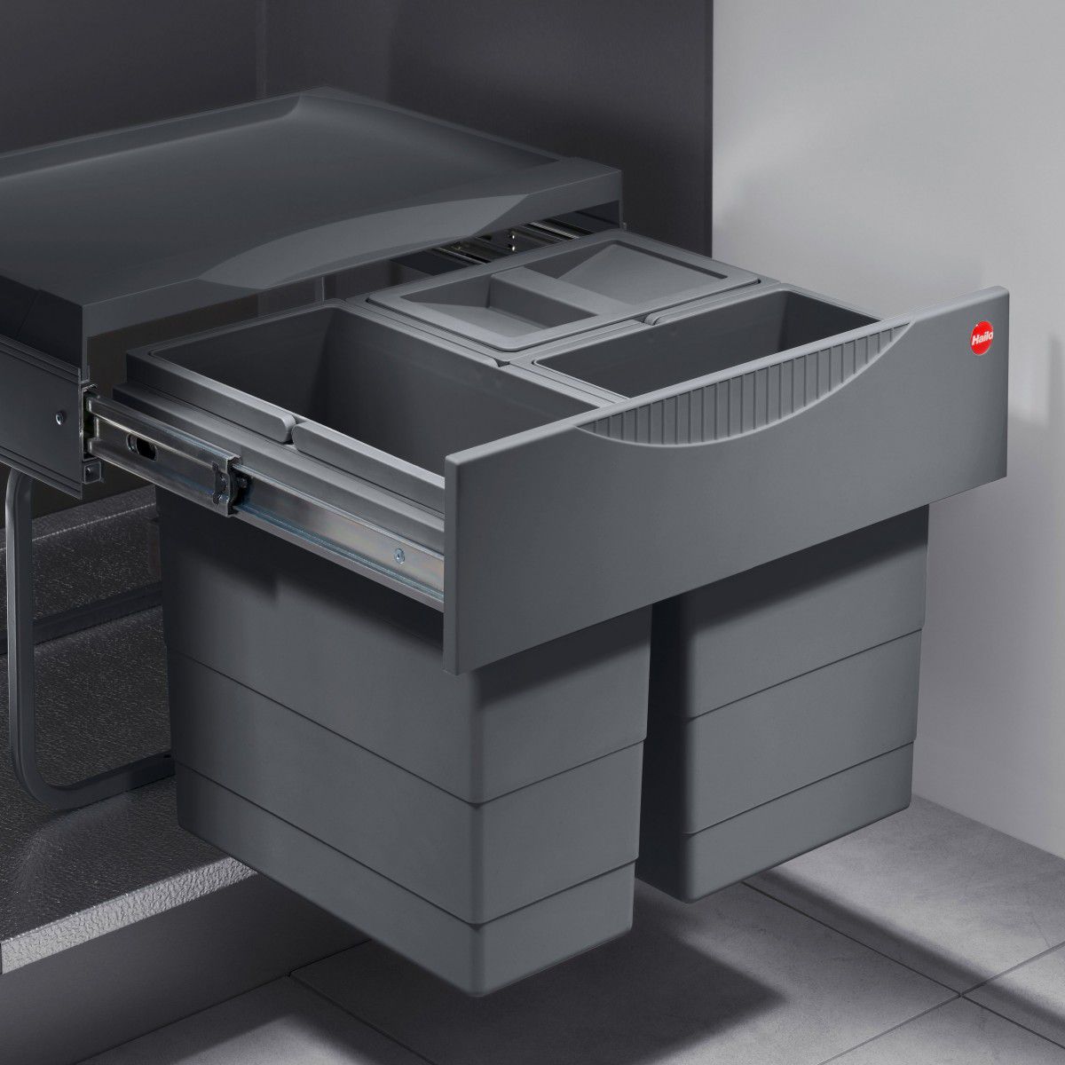 Merk: Hailo Kleur: Donker grijs Montage: Op de kastbodem, volledig uittrekbaar. Voor kastbreedte: 500 mm. Inhoud: 29 liter (12 + 8.5 + 8.5) Kastdeurlogo: Draaideurkast Afvalscheiding: Ja portokostentarief: Pakketpost