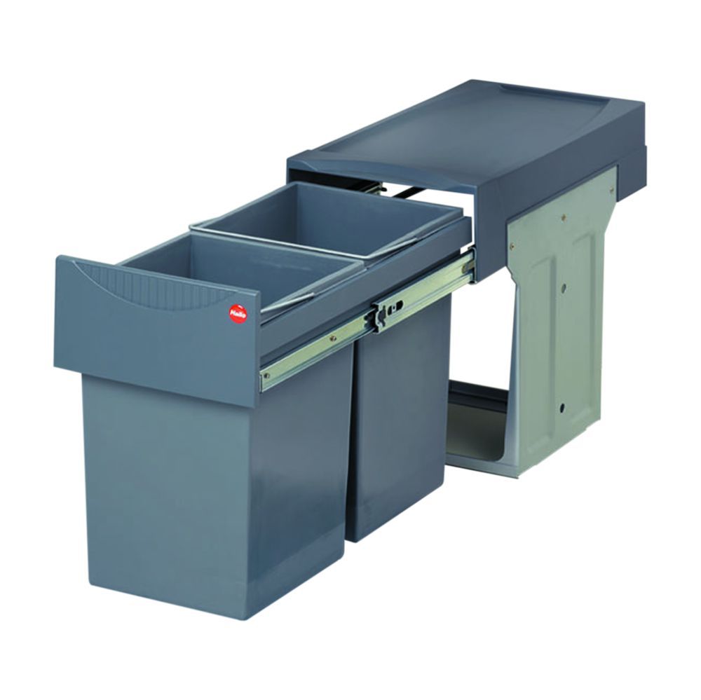 Merk: Hailo Kleur: Grijs/Zilver Montage: Op de kastbodem, volledig uittrekbaar. Voor kastbreedte: 300 mm. Inhoud: 30 liter (2 x 15). Kastdeurlogo: Draaideurkast Afvalscheiding: Ja portokostentarief: Pakketpost